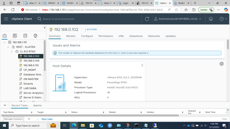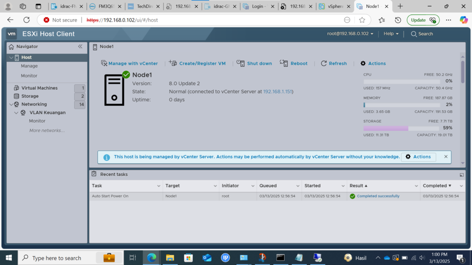 Pada hari jumat, 7 Maret 2025 teknisi Dell sudah melakukan penggantian ke motherboard lama dan server sudah bisa masuk/diakses, tetapi hasil troubleshoot dari teknisi Dell kemarin ada 1 RAM yang terindikasi error/rusak. untuk park RAM pengganti masih di requestkan dan sudah ada akan dilanjutkan kembali perbaikan Server